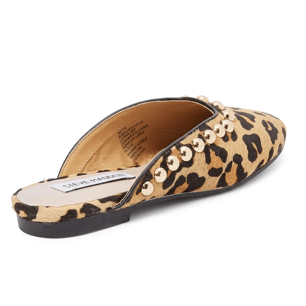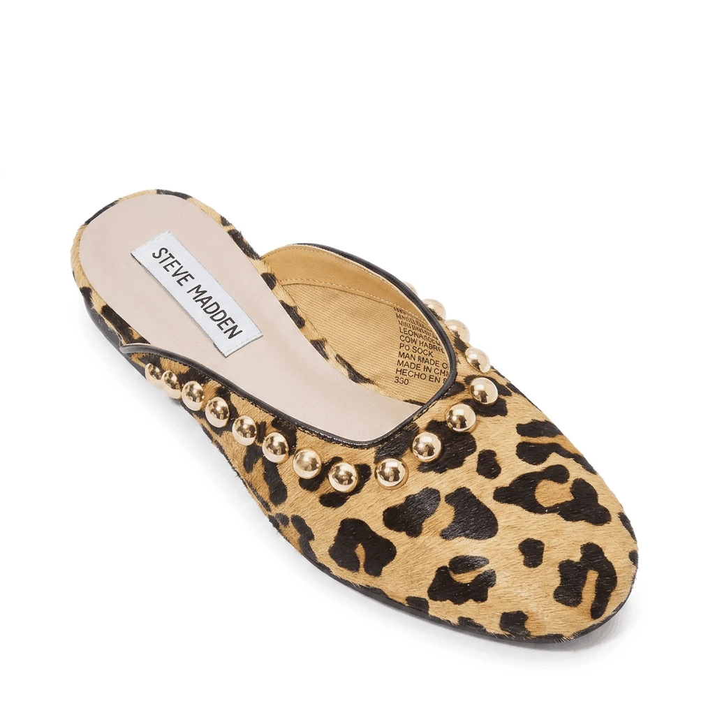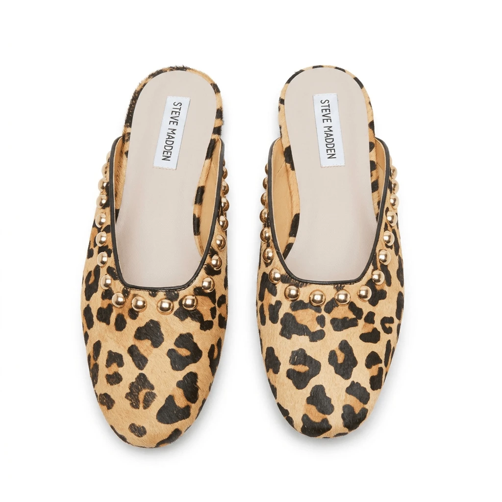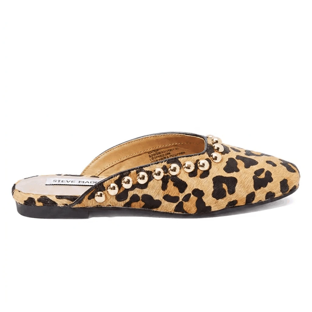 Make a fierce impression with these Steve Madden leopard print sandals, where bold patterns meet edgy hardware. Designed for those who aren't afraid to stand out, these slides feature a striking animal print upper accented with metallic stud embellishments for a touch of rock-and-roll flair.
