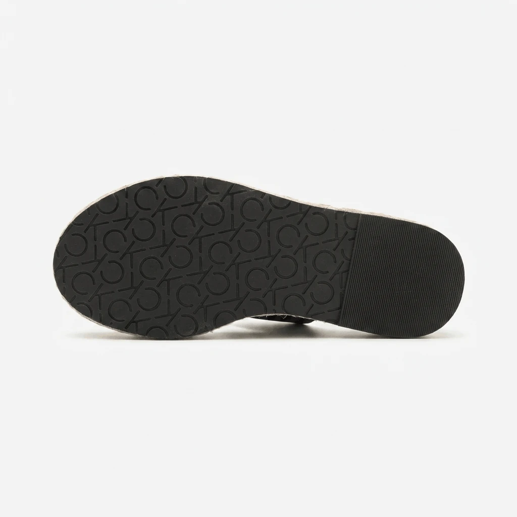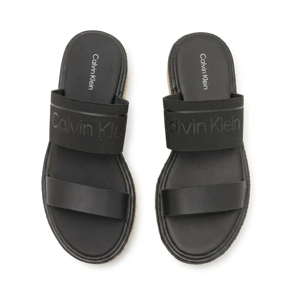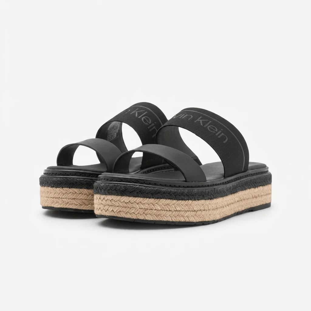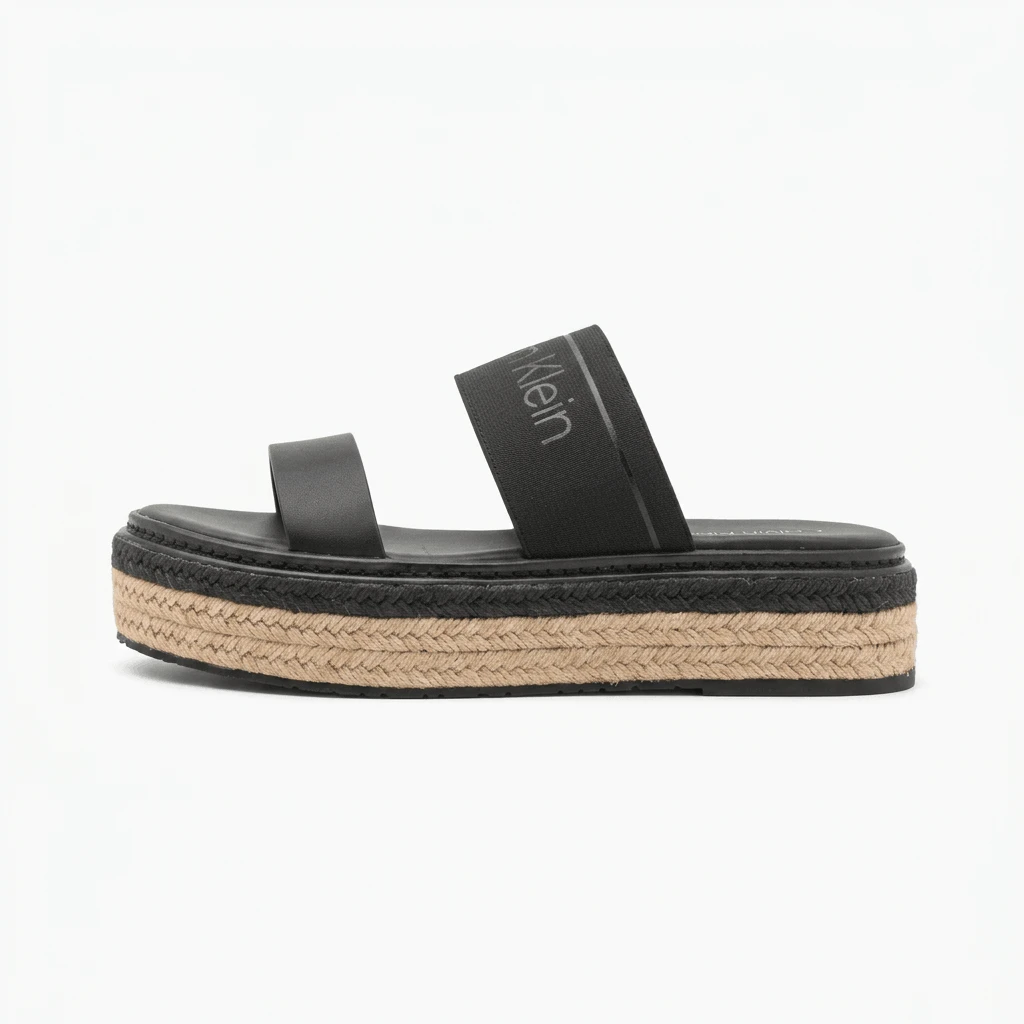 صندل كالفن كلاين الأسود المفتوح من الخلف هو صندل أنيق مسطح بتصميم عصري متطور مع شريط مزدوج. يُعد هذا الصندل جزءًا من علامة كالفن كلاين العالمية، ويجسد جمالية عصرية بسيطة تتميز بتصميم خالد وجودة عالية.