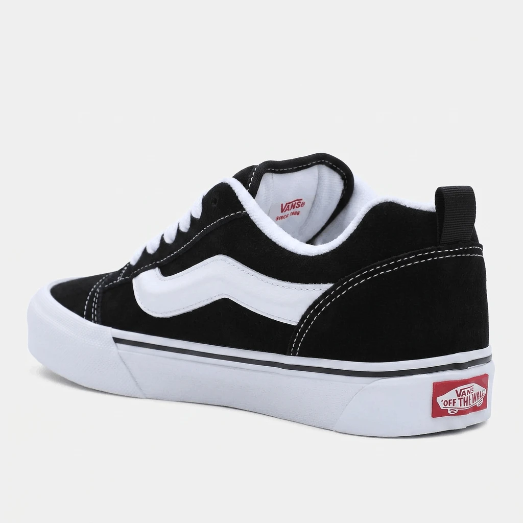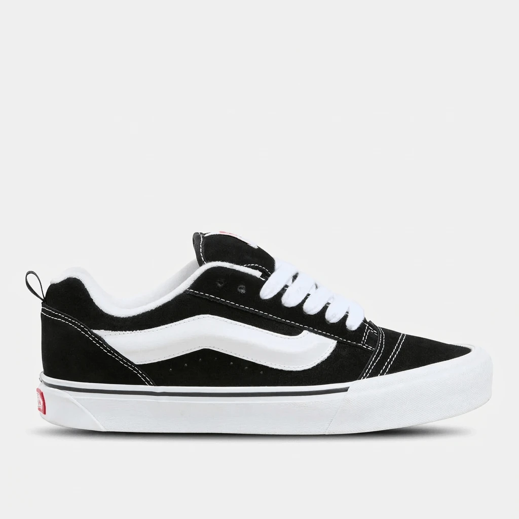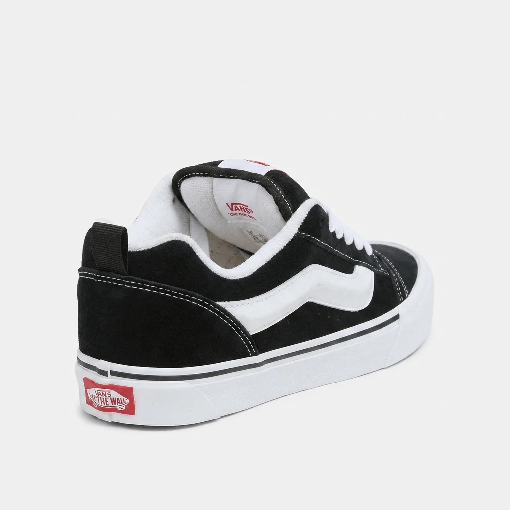إذ تعيد طراز التسعينيات الجريء إلى شوارع المدينة، تُعد أحذية "Vans Knu Skool" تجسيداً عصرياً ومبتكراً لحذاء التزلج الكلاسيكي منخفض القصة. صُممت هذه الأحذية الرياضية بجزء علوي متين من جلد الشمواه، وتتميز بلسان وياقة حول الكاحل مبطنين بشكلٍ بارز؛ مما يمنحها ذلك المظهر الكلاسيكي "المنتفخ" والأيقوني دون التضحية بالراحة التامة طوال اليوم. كما يوفر النعل الأوسط الناعم تجربة مشي مريحة ومبطنة، بينما يضمن النعل الخارجي المطاطي المميز بنقشة "الوافل" تلك الثبات الموثوق الذي اشتهرت به علامة "Vans". وتكتمل أناقة حذاء "Knu Skool" بعروة سحب عملية عند الكعب وشريط جانبي كلاسيكي، مما يجعله الخيار الأمثل لكل من ينشد مزيجاً فريداً يجمع بين ثقافة التزلج الكلاسيكية والمتانة العملية الملائمة للاستخدام اليومي الشاق.
