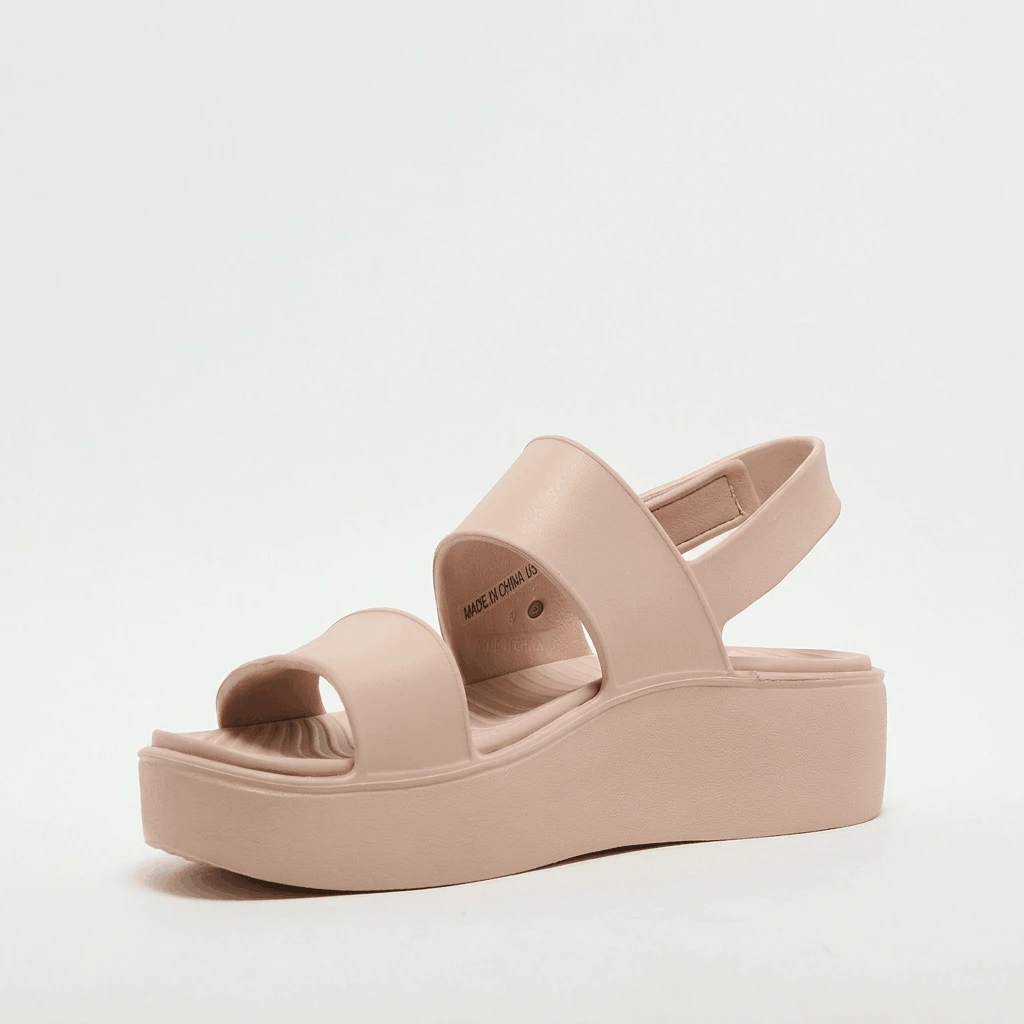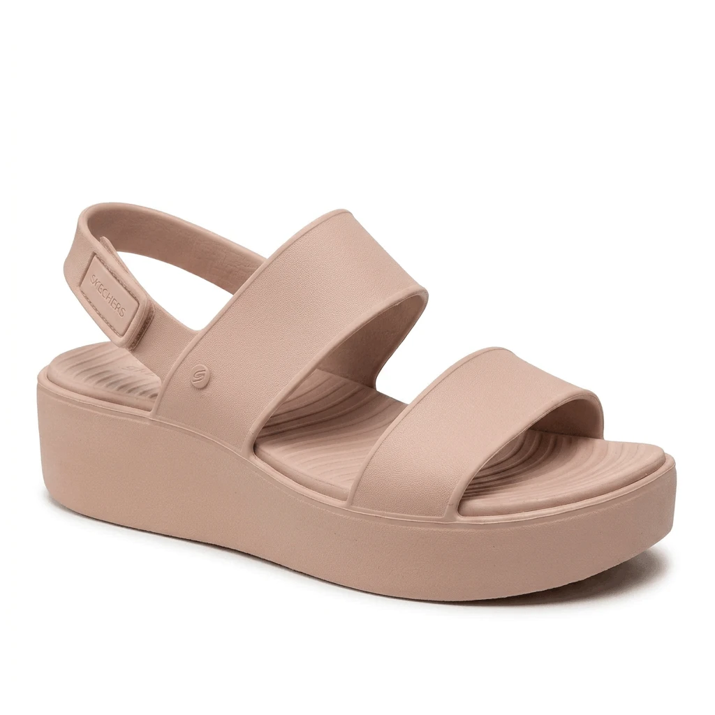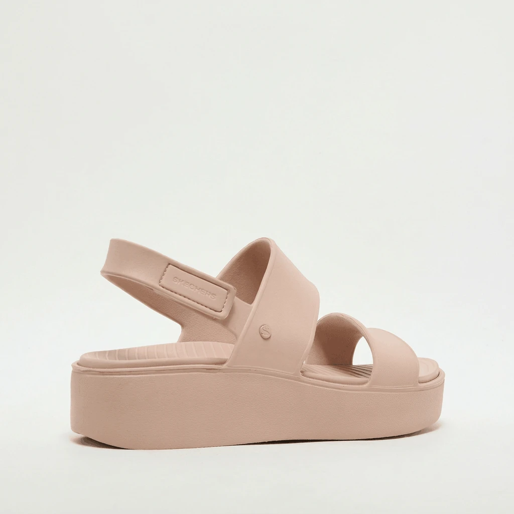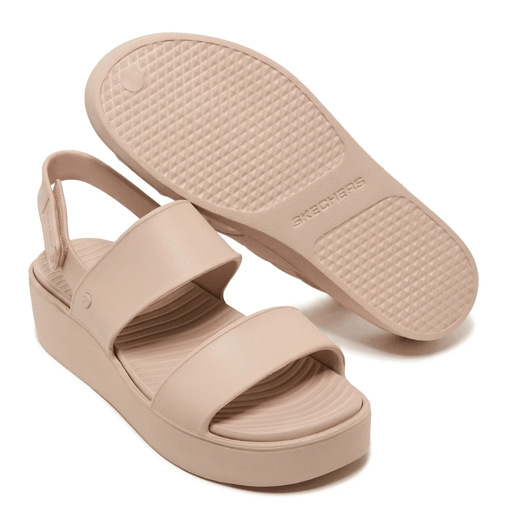 The Skechers Foamies®: Arch Fit® Upbeat - Sunrise is designed for those who want the elevation of a platform sandal without sacrificing ergonomic support. This model features a breathable, lightweight Foamies® EVA upper with a stylish double cross-band design and a secure, adjustable slingback strap. The core highlight is the patented Arch Fit® footbed, which provides podiatrist-certified arch support developed with 20 years of data and 120,000 unweighted foot scans. The contoured footbed helps mold to your foot to reduce shock and increase weight dispersion, making it a perfect companion for all-day summer wear.